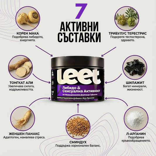 Leet Natural са натурални добавки под формата на дъвчащи таблетки – без ГМО, без захар, клинично тествани формули, създадени за хора, които искат реални резултати!