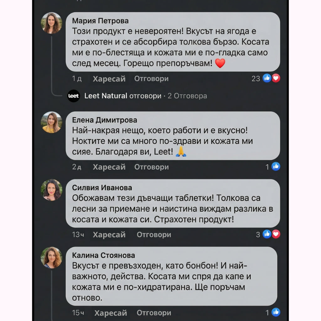 Повечето потребители започват да забелязват първи промени в рамките на 2 до 3 седмици – като намален косопад, по-гладка кожа и по-здрави нокти. За оптимални и дълготрайни резултати препоръчваме поне 8 седмици редовен прием на Leet Красота.
